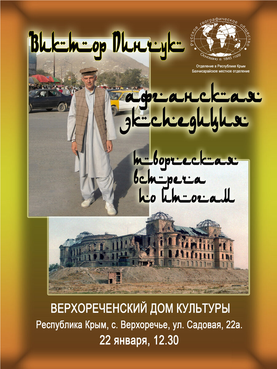 22 января 2024 года в Верхореченском доме культуры, расположенном в 17-и километрах от Бахчисарая состоится встреча с российским путешественником, объехавшим 60 стран мира (Азия, Африка, Океания и Латинская Америка), используя методику бомж-туризма. Мероприятие проводится по итогам афганской экспедиции, маршрут которой включил семь азиатских стран, где не обошлось без приключений. Автор представит книгу «Афганский арестант», созданную в жанре путевого очерка. Начало в 12:30. Вход свободный. Адрес: Крым, Бахчисарайский район, с. Верхоречье, ул. Садовая, д. 22а. ********************************* См. также: телесюжет по теме (ТРК "Крым")