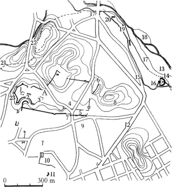 Схема Акрополя в современной Спарте: 1 – храм Афины Меднодомной; 2 – театр; 3 – Лакедемония; 4 – круглое здание; 5 – портик; 6 – северные ворота; 7 - южные ворота; 8 – Колона (?); 9 – агора; 10 – могилы царей (?); 11 – храм, так называемая «усыпальница Леонида»; 12 – дорога на Триполи; 13 – Лимнеон; 14 – святилище Артемиды Орфии; 15 – Тагарис-парк; 16 – храм; 17 – стена старого города; 18 – Еврот; 19 – Геройон; 20 – алтарь Ликурга; 21 – следы древней городской стены; 22 Моундуна; 23 – фундамент римской стены.