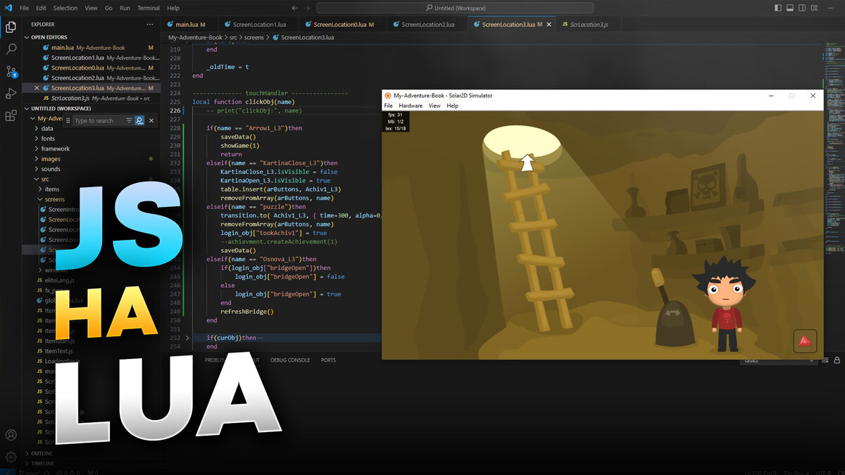 Коротко Портировать игры с одного языка на другой, очень просто, если они похожи друг на друга и отличаются несильно. Ранее портировал с языка на язык (as3, js, lua, с# ). Даже solidity, но там Ж) Чуть больше текста Портировать игры с JS на LUA очень просто. С 2012 по 2017 я делал это часто. Т.к. я с 2018 года Project Manager, то давно этим не занимался. Но тут решил вспомнить молодость и игру, разработанную в 2015 году решил портировать в Steam и выпустить бесплатно. Она для детей) Это короткий фрагмент (там нудно, можно просто прокликать), как я портирую игру в жанре point&click с PixiJS (html5) на Solar2D (Steam, mobile). Прошлый раз я эту игру создал с нуля за неделю (или меньше). Т.к. она оч простая, то подумал что потратить на разработку это время не жалко и проверить что там в Стим, как бесплатные игры заходят сейчас, все также никому не нужны без маркетинга или есть какая-то органика. Если вы знаете ответ про органику, пишите в комментариях, но я все равно залью в стим ради спо
