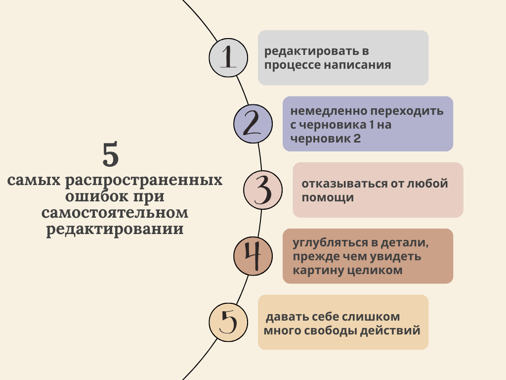 Саморедактирование — это часть процесса письма, которая помогает вам собрать тысячи случайных кусочков головоломки в одну связную картину. Однако вопреки распространенному мнению, самостоятельное редактирование заключается не только в проверке грамматики, опечаток и пунктуационных ошибок. Речь идет о том, чтобы приблизить всю вашу книгу, статью или диссертацию к раскрытию ее полного потенциала. Ниже представлены самые распространенные ошибки, которые авторы допускают при самостоятельном редактировании: Ошибка № 1: редактировать в процессе написания. Стоит отметить, что редактирование во время написания не так уж и плохо, однако важно количество внесенных вами изменений. Например, вы перечитываете главу, прежде чем начать писать новую. Естественно, во время чтения будут всплывать вещи, требующие редактирования. Целесообразно редактировать только часть из них, исправляя опечатки и грамматические ошибки, помечая предложения, в которых вы не уверены. Редактируя текст параллельно с его напи