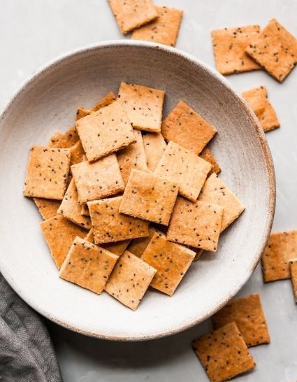Легкие и вкусные палео-крекеры, которые содержат много белка и полезных жиров. Вам понадобится всего 4 ингредиента для этих восхитительно хрустящих крекеров с низким содержанием углеводов и глютена. Такие крекеры можно подавать в качестве закуски вместе с хумусом, гуакамоле или другим любимым соусом. Ингредиенты: Способ приготовления: 1. Разогрейте духовку до 180 С. В большой миске смешайте миндальную муку, яйцо, семена чиа, соль и чесночный порошок. Возможно, вам придется использовать свои руки, чтобы собрать все воедино. Тесто должен быть похоже на мокрый песок, но все равно будет держаться вместе. 2. Выложите смесь на пергаментную бумагу, затем накройте еще одним листом пергаментной бумаги. Раскатайте тесто между двумя листами (тесто должно быть ОЧЕНЬ тонким). Возможно, вам придется руками разгладить края теста. Очень осторожно перенесите раскатанное тесто прямо на пергаментной бумаге на большой противень. Вы также можете разделить тесто пополам и выпекать на двух противнях меньшег