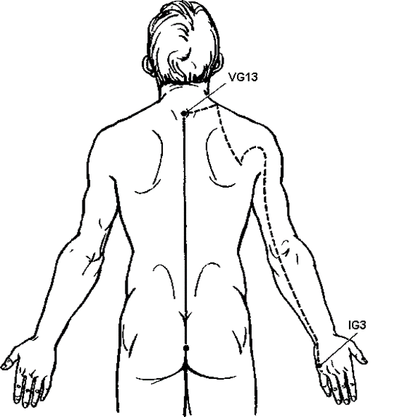 Траектория его идентична заднесрединному меридиану; но от точкиVG13 тао-дао возникает анастомоз к меридиану тонкой кишки через точку Е12 цюэ-пэнь, откуда происходит связь с точкой-ключом — IG3 хоу-си (рис. 22). Связующая точка с ЧМII — V62 шэнь-май.