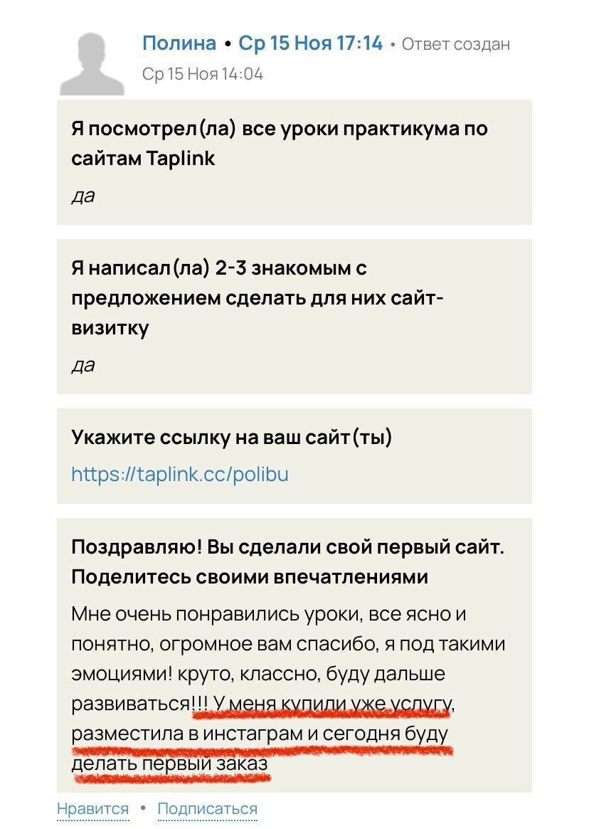 – написала нам наша ученица с бесплатного курса) А мы в свою очередь хотим сказать спасибо вам! Спасибо, что делитесь!❤️ Всегда очень радуемся вашим успехам и делаем всё, чтобы их становилось только больше ✨ Умение искать клиентов – это так же важно, как и качество услуги, которую вы предлагаете. ↪️На полном курсе «Технический специалист онлайн-школ» мы даем еще больше прикладных советов по поиску клиентов и даже проводим целый ПРАКТИКУМ по поиску заказчиков Если делать всё по шагам – просто невозможно остаться без клиентов В среду, 17 января, начинается обучение «Технический специалист онлайн-школ»🎯 Оставляйте заявку на сайте и мы поможем присоединиться на самых лучших условиях! https://terentev-school.ru/ 🎁Регистрируйтесь на наш бесплатный курс по старту на фрилансе Зарегистрироваться по ссылке👇