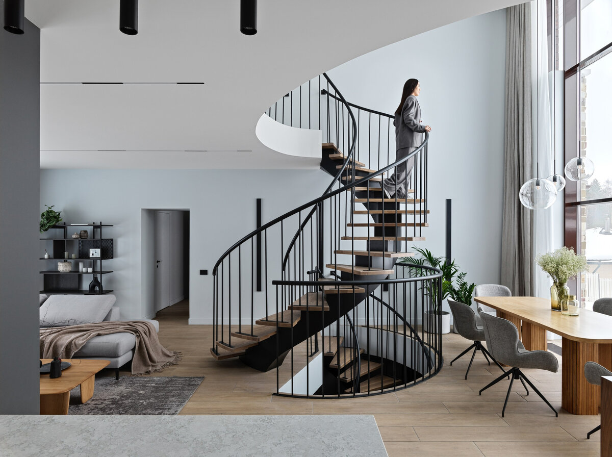 Большая площадь трехэтажного дома позволила грамотно и органично спроектировать помещения. У каждого члена семейства свое личное пространство, оформленное с учетом возраста и интересов. Помимо гостиной-кухни, спален и детских в доме спроектированы шесть санузлов, гостевая комната и кабинет, хамам и тренажерный зал, живой камин и потрясающая винтовая лестница с графичными перилами, элегантно соединяющая три этажа, — главная изюминка интерьера.
