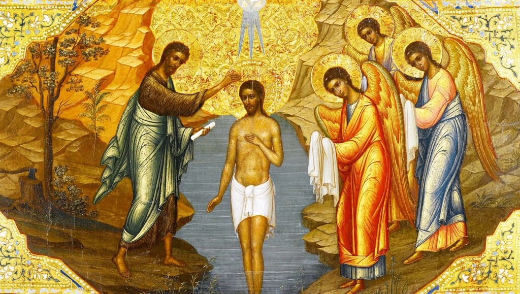 Как на древних, так и на современных иконах смысловым стержнем и композиционным центром изображения является фигура Спасителя. По великому смирению Господь принял Крещение от пророка Иоанна, и не Сам освятился водами, в чем не было нужды, но освятил Собою водное естество и с ним – весь мир. Как при сотворении мира Бог касается, очищает и животворит водное естество, так в Крещении Своем Христос погружается в воды, чтобы очистить, оживотворить и освятить их…