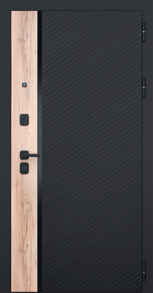 Петли: 3 петли с подшипником. Внешняя отделка: наружный лист металла 1,5 мм. Панель МДФ 10 мм. Объемная фрезеровка. Цветовая комбинация: “дуб галиф натур”, “шагрень черная”. Декоративная пластиковая вставка, цвет "черный". Наличник МДФ 80 мм., цвет “черный кварц”.