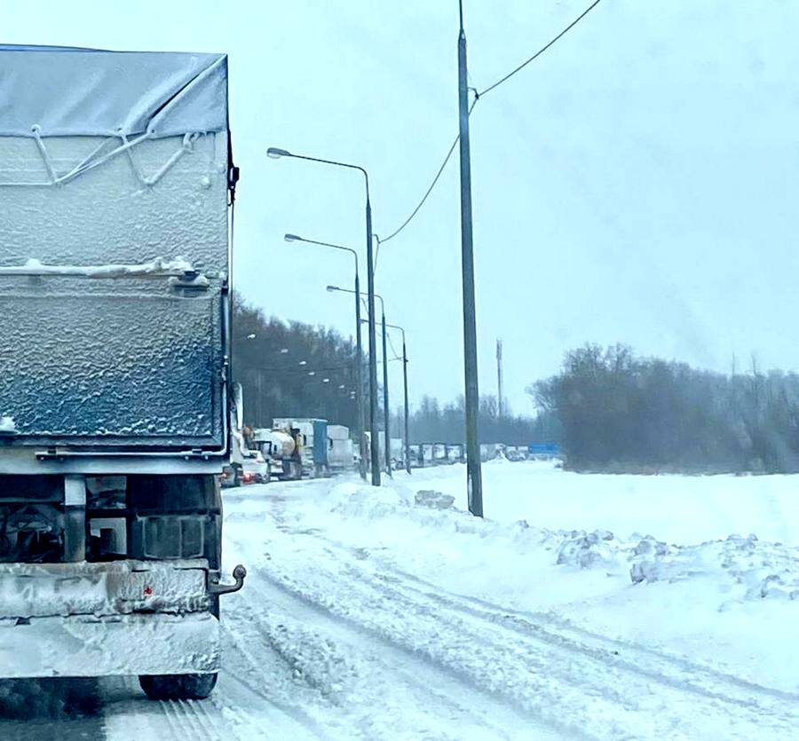 В Курской области из-за сильного снегопада собралась пробка на федеральной трассе М-2