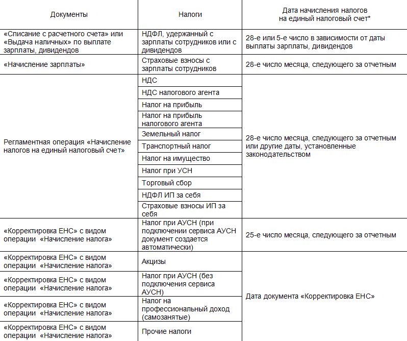 Учет расчетов на едином налоговом счете в программе 1С:Бухгалтерия В программе «1С:Бухгалтерия 8» начиная с версии 3.0.147 задолженность по уплате налогов теперь отражается на ЕНС так же, как в личном кабинете ФНС, на дату наступления срока их уплаты, установленную законодательством. Для формирования совокупной обязанности по уплате налогов и взносов на счете 68.90 «Единый налоговый счет» достаточно начислить и выплатить зарплату и выполнить закрытие месяца. Теперь в закрытие месяца добавлена регламентная операция «Начисление налогов на единый налоговый счет». Упрощена корректировка ЕНС. Для этого добавлен документ «Корректировка ЕНС», в котором по видам операций автоматически подбираются счета учета. Выполните следующие шаги, чтобы определить сумму очередного единого налогового платежа: 1. Создайте документы для начисления налогов на ЕНС Используйте новый документ «Корректировка ЕНС», чтобы отразить на ЕНС налоги, которые рассчитываете вручную: 2. Подготовьте и отправьте в ФНС уведомл