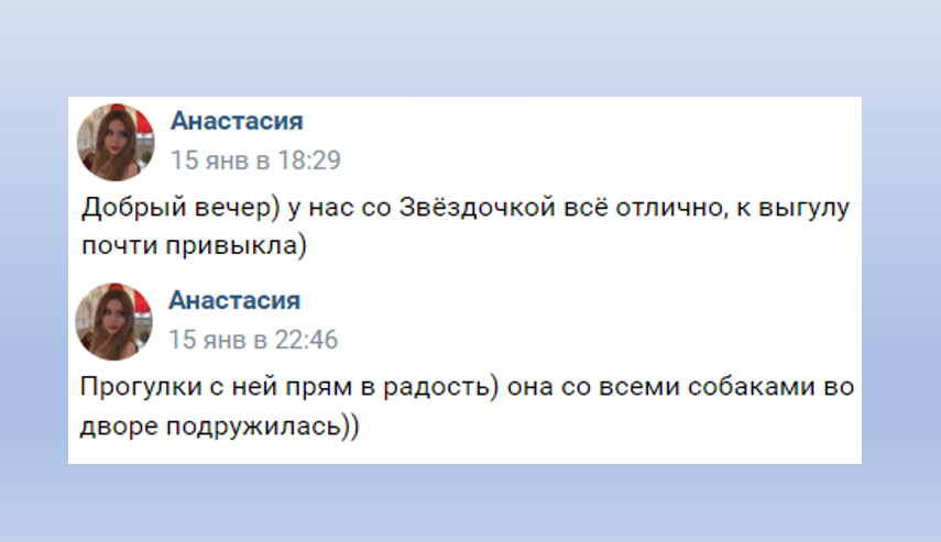 Я так благодарна своим волонтерам, что они нашли мне эту удивительную семью. Без их заботы, я бы, возможно, так и осталась бездомной собачкой. Однако теперь у меня есть дом, где я чувст