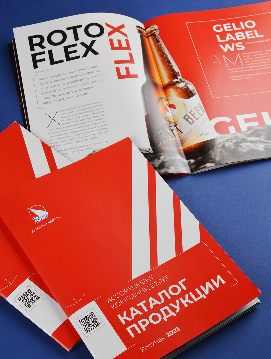 Наша дружба с крупнейшим поставщиком бумаги и картона, компанией «Берег» — это судьба. Мы вместе сделали уже столько календарей, каталогов, прайс-листов и семинаров, что можно издавать альбом-трёхтомник. Мы любим «Берег» и всегда готовы ради друзей на подвиг. А подвиг часто нужен. Особенно, когда речь идёт о каталогах. Если бы существовал рейтинг работ, на которые отводится меньше всего времени, то каталоги опередили бы всех с огромным отрывом. И это при том, что именно для каталогов нужно обрабатывать больше всего материалов! Big data полиграфии! Самая большая сложность каталога, посвященного бумагам, — тот факт, что напечатан он будет на бумаге одного сорта и без модных полиграфических фишек. Поэтому всё разнообразие фактур, цветов, особенностей мы можем показывать исключительно с помощью дизайна. Именно дизайн создаёт эмоцию, объясняет преимущества выбора, формирует желание сделать заказ здесь и сейчас. Каталог отправился сразу на несколько выставок. И не только российских