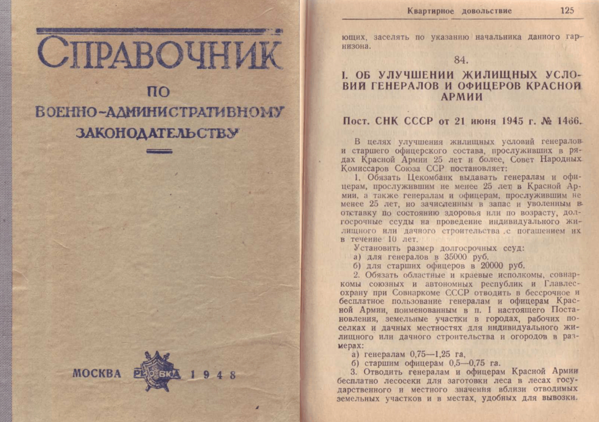Удивительно чудная вещь старая книга, в ней можно найти даже то, о чем и не подозревал. Перебирая свои архивы, вдруг наткнулся на славную книжицу: Справочник по военно-административному законодательству / Сост. доцент, майор юстиции И.Ф.Побежимов. 2-е издание. М.: РИО Военно-юридической академии, 1948.- 422 с. Эта книга напрочь разоблачает антисоветский миф, что в при Сталине не было никой заботы о ветеранах войны. Из этой книги можно узнать, что, например, офицеры получали в бессрочное и бесплатное пользование от половины - до 1,25 гектара земли для индивидуального жилищного или дачного строительства. Давались ссуды на строительство жилья в размере 20-30 млн. руб. (на наши деньги), эти ссуды погашались (списывались) государством после 10 лет. Было полное освобождение от налогов и земельной ренты. Квартирная плата для ветеранов была 35-80 коп. за кв. м. при том, что зарплата была от 300 до 750 рублей (тыс. на наши деньги). Была целая система как денежных, так и натуральных льгот ветера