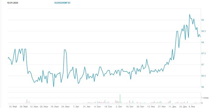 Аналитики брокера ВТБ посчитали, что с учетом высокой ключевой ставки - 16%, спектр внимания инвесторов перемещается с акций в инструменты долгового рынка. Специалисты прогнозируют жесткую монетарную политику Центрального банка на этот год, в том числе они подтвердили прогноз о нескором снижении ключевой ставки в силу того, что инфляция "отклонилась от цели". И исходя из таких вводных инвесторам лучше оставаться в инструментах денежного рынка и ликвидных ОФЗ с плавающей ставкой доходности, которая будет коррелировать с ключевой, то есть держать флоатеры! Оказывается, всё гениальное - просто. ВТБ открыли мне глаза на рынок облигаций 🤣 Ладно, шутки в сторону, так как аналитики ВТБ действительно правы. Мы не знаем куда дальше будет двигаться инфляция и ключевая ставка, поэтому флоатеры действительно помогают доходности бумаг не отставать от роста рыночной доходности. 1. ОФЗ 29024 👉Дата выпуска - 03.05.2023г. 👉Дата погашения - 18.04.2035г. До погашения еще очень далеко, но плавающая ста