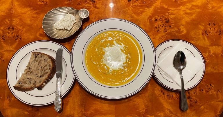 Jinju Bistro (Усачева, 15а) открыла команда кофеен с тем же названием. В новом бистро появились полноценное меню и вино, а не только кофе, сэндвичи и выпечка. Цены высокие. Народу полно. Плюсы: — приятное ощущение, что забежал в дом к хорошим знакомым, а они прямо в гостиной открыли ресторан. Фирменная деталь обстановки всех Jinju — элегантная стена из стеклоблоков тем не менее на месте; — чистая открытая кухня и слаженная работа поваров просматриваются со всех сторон; — девушки из окрестных домов, расслабленные и без излишков косметики, едят с аппетитом и первое, и второе, и десерт, не забывая про вино; — уютный сервис и самоотверженный персонал; — легкий и гладкий тыквенный суп со страчателлой (710 руб.). Вместо привычных сухариков в нем используются кусочки свежего фенхеля — отличная находка. Кроме того, в суп добавлен кардамон. Получается очень интересно и познавательно с точки зрения гастрономического кругозора и органолептической многослойности; — элементарный фермерский цыплено