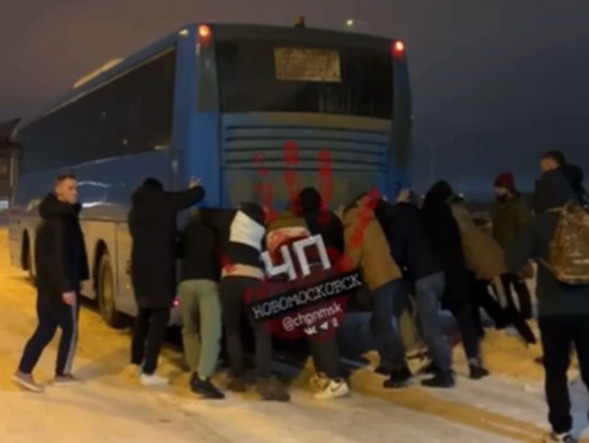 Рабочим завода в Узловой пришлось самим выталкивать автобус на трассу из-за гололеда