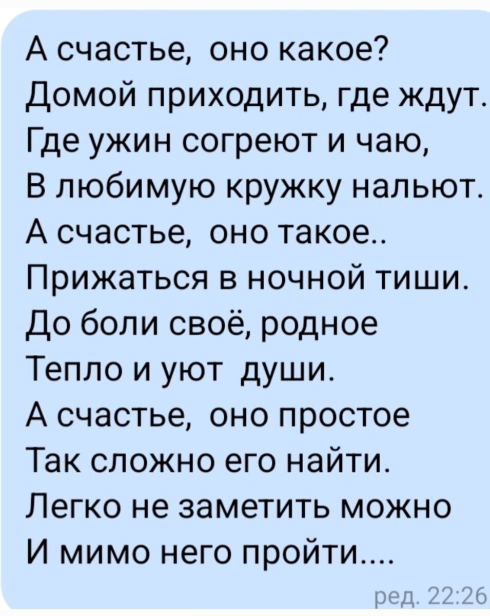Не знаю, то ли времени нет, то-ли желания на эту самую личную жизнь. Живёшь и живёшь, уже как то по инерции. Всё ясно и понятно. Дом, дети и работа. Ну вот ещё дзен добавился. Не знаю куда его отнести, с работе или к развлечению. Наверное к развлечению, вернее к увлечению. Работа она ведь деньги приносит. Поэтому точно не работа. И где её найти эту личную жизнь. Конечно, где то в глубине души, хочется встретить мужчину-друга. Ходить куда то вместе. Люблю например театр, да и просто пойти прогулятся. Время нашлось бы, просто сейчас мне освобождать его не для кого. Дети ещё немного и разьедуться кто куда, и буду я приходя с работы кричать АУ в пустой квартире. А хочется вечером с кем нибудь попить чай, посмотреть фильм обнявшись. Не это ли счастье. ? Но мне как то никогда не везло в личной жизни. Да была замужем, родила детей. Но это было так давно, что уже и не правда. На меня как то не обращают внимания, не знакомятся со мной. Может со мной что то не так? И да, даже когда я бы