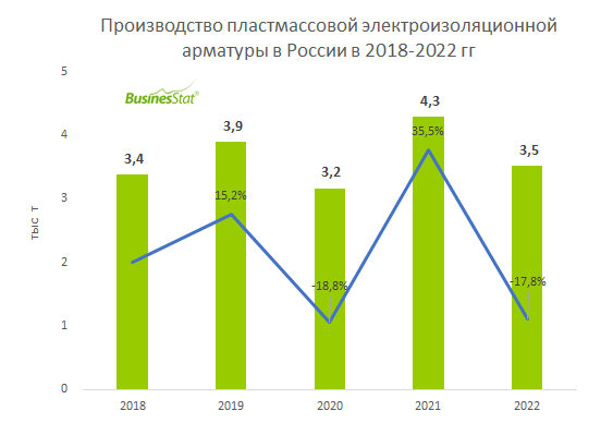 Производство пластмассовой электроизоляционной арматуры в России в 2022 г снизилось на 18% и составило 3,5 тыс т.