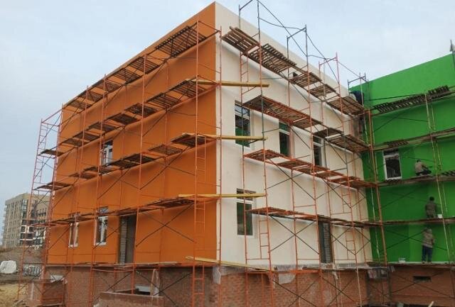 На участках, где стены уже возвели до конца их утепляют минеральной ватой, затем штукатурят и на финальном этапе красят в яркие цвета. Одновременно, внутри здания строители монтируют перегородки из пазогребневых плит и инженерные сети: отопления, вентиляции, водоснабжения, канализации и электроснабжения.