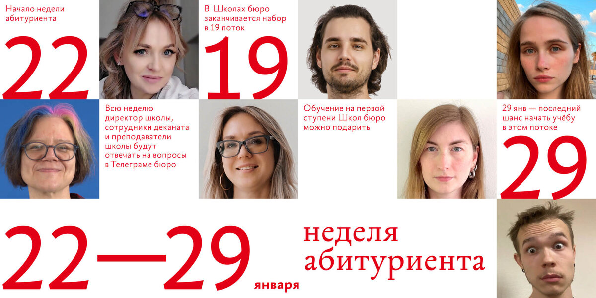 В Школах бюро заканчивается набор в 19 поток. 29 января — последний шанс начать учёбу в этом потоке. Если студент начнёт занятия позже, то попадёт уже в следующий поток школы с началом второй ступени на полгода позже. Чтобы поддержать абитуриентов, всю неделю 22—29 января директор школы Николай Товеровский, сотрудники деканата и преподаватели школы будут отвечать на вопросы в Телеграме бюро — приходите поговорить об учёбе, карьере или просто поболтать.