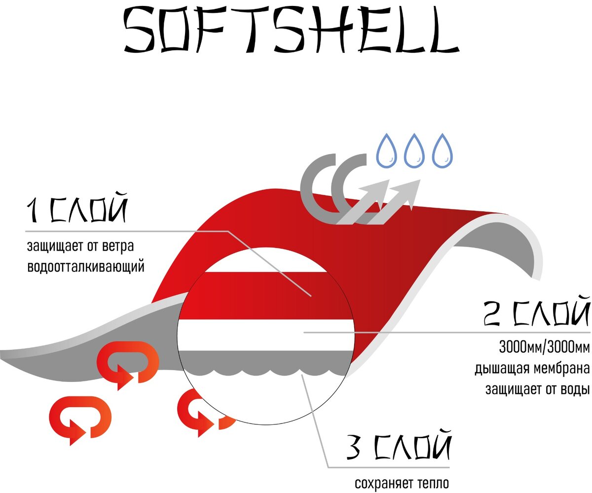 Что такое Softshell? Это синтетическая ткань, состоящая из нескольких слоев, каждый из которых выполняет определенную функцию. Внешний слой защищает от ветра, благодаря специальной мембране, которая препятствует проникновению холодного воздуха. Внутренний слой обеспечивает отличную теплоизоляцию, сохраняя тепло тела. А внутренний слой отводит излишнюю влагу, поддерживая комфортный микроклимат на поверхности кожи.
