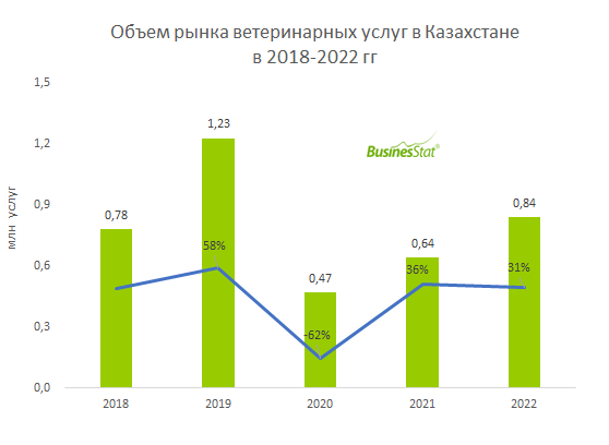 За 2020-2022 гг объем рынка ветеринарных услуг в Казахстане вырос на 79% и составил 0,84 млн услуг.