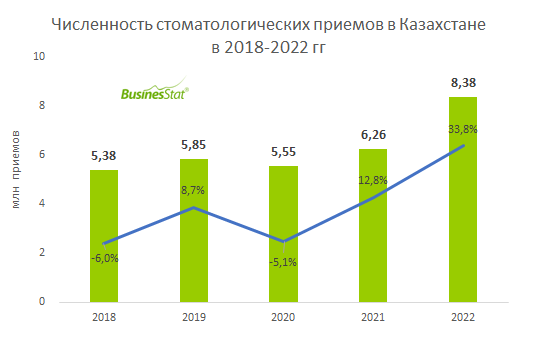 В 2022 г количество приемов в стоматологических клиниках Казахстана выросло на 34% и достигло 8,38 млн.