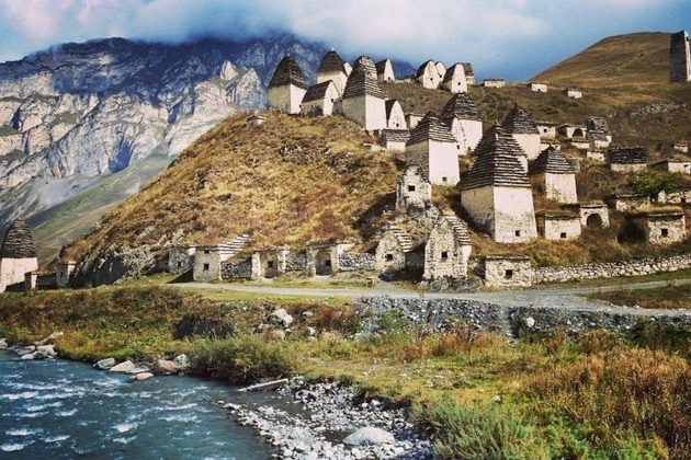 Целый город склепов расположен на склоне горы Раминырах, в живописной долине между Куртатинским и Кармадонским ущельями. Крутой серпантин ведет через перевал. Бесконечные ряды башенок, а которых покоятся сотни тел, выглядят одновременно жутко и завораживающе. В окошках до сих пор можно разглядеть останки – кости, черепа, фрагменты одежды. А внизу несет свои воды речка Гизельдон. Название «Даргавс» происходит от либо от осетинских слов даргъ («длинный») и фæз («поляна»), - долина, и правда, достаточно длинна, или от осетинского дуаргæс («защитник ущелья»). Долина была заселена еще в бронзовом веке, здесь обитали аланы – предки осетин. Позже, в средние века, согласно преданию в селе Даргавс жил царевич Тага, от которого пошли многие знатные фамилии Осетии. На рубеже XVIII и XIX веков в Северной Осетии бушевала чума, сотни и тысячи людей умирали от страшной болезни. Чтобы дать хоть какой-то шанс выжить здоровым, заболевшие уходили умирать в склепы. Впрочем, погребальные башни были постро