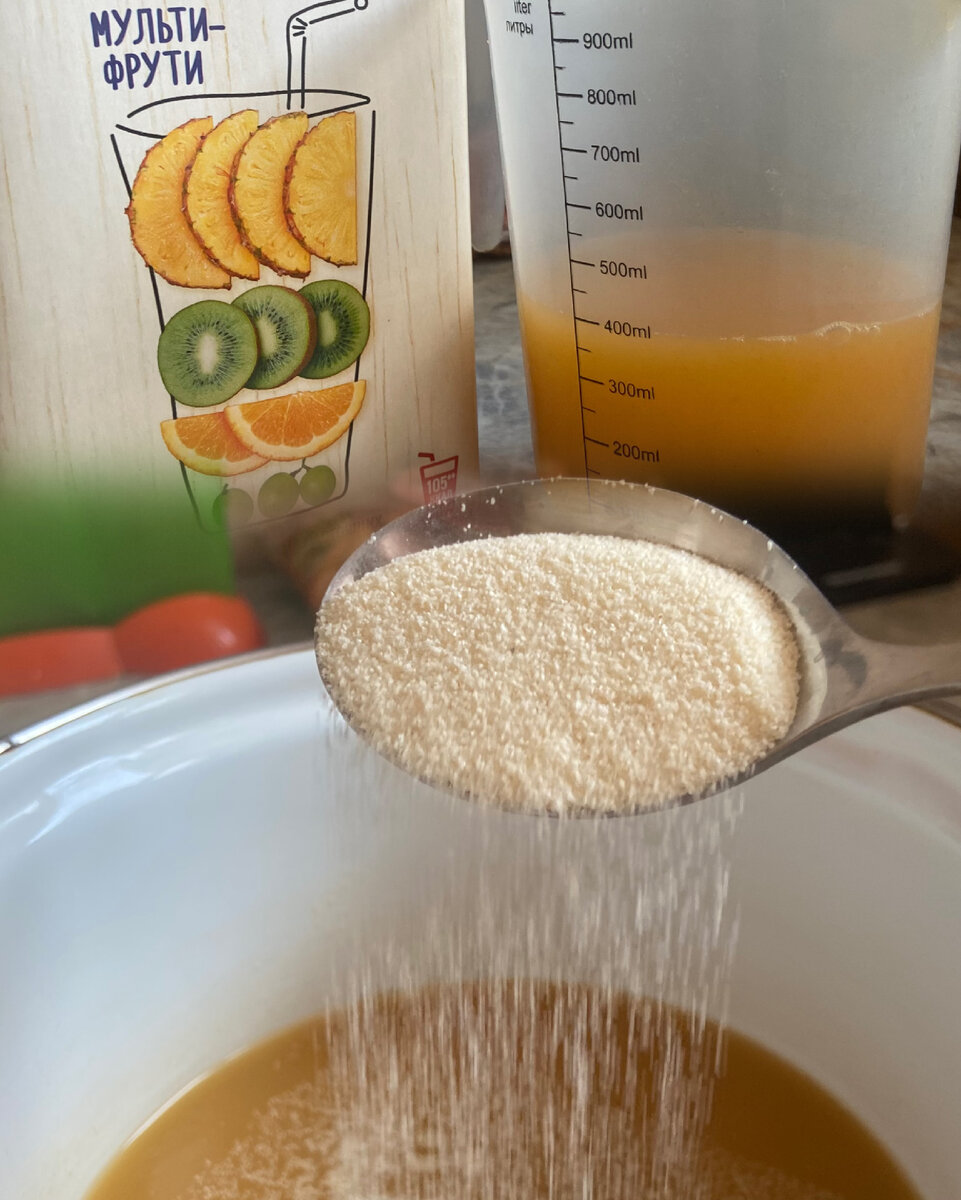 Накормить мою малоежку, это как пройти семь кругов ада. И когда вчера, мне попался один довольно простенький рецепт вкусняшки, я подумала «А не попробовать ли мне его приготовить». Тем более в нем всего 2 ингредиента: СОК и МАННАЯ КРУПА Для приготовления нам понадобится: Сок - 400 мл.; Манная крупа - 2 столовые ложки. Сок ставим на огонь, добавляем манную крупу и варим. Наверное как бы кашу… В течение 5 минут. После того как крупинки манки набухнут, снимаем с огня, переливаем массу в удобную емкость и взбиваем погружным миксером до состояния пены. После, массу можно перелить по порционным тарелочкам и поставить в холодильник. Я не стала заморачиваться и поместила прямо в тазике в котором взбивала. По истечению 2 часов можно пробовать. Масса застынет, а её консистенция будет мягкой и воздушной…тает во рту. И все бы ничего… Вкусно, но с горчинкой… Возможно так получилось из-за покупного сока. Если бы это был свежевыжатый сок, или компот, или морс из домашнего варенья, то вкус был бы боле