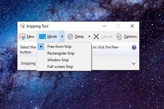 Шаг 2: В Windows 10 выберите кнопку "Режим", чтобы раскрыть ее меню. Вы найдете четыре варианта захвата экрана: Нарисовать окно (Свободный снимок), обвести рамкой область (Прямоугольный снимок), захватить текущее окно (Оконный снимок) и захватить весь экран (Полноэкранный снимок).