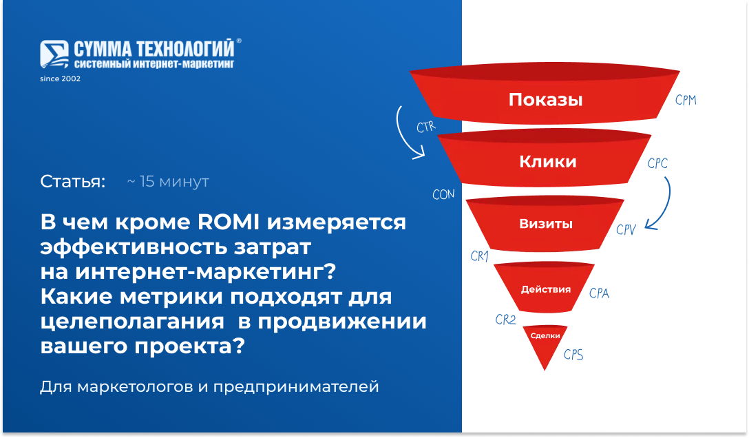 Если ROMI одной цифрой описывает эффективность затрат, то остальные метрики эффективности нужно использовать как пары абсолютных и финансовых метрик, количество +стоимость.