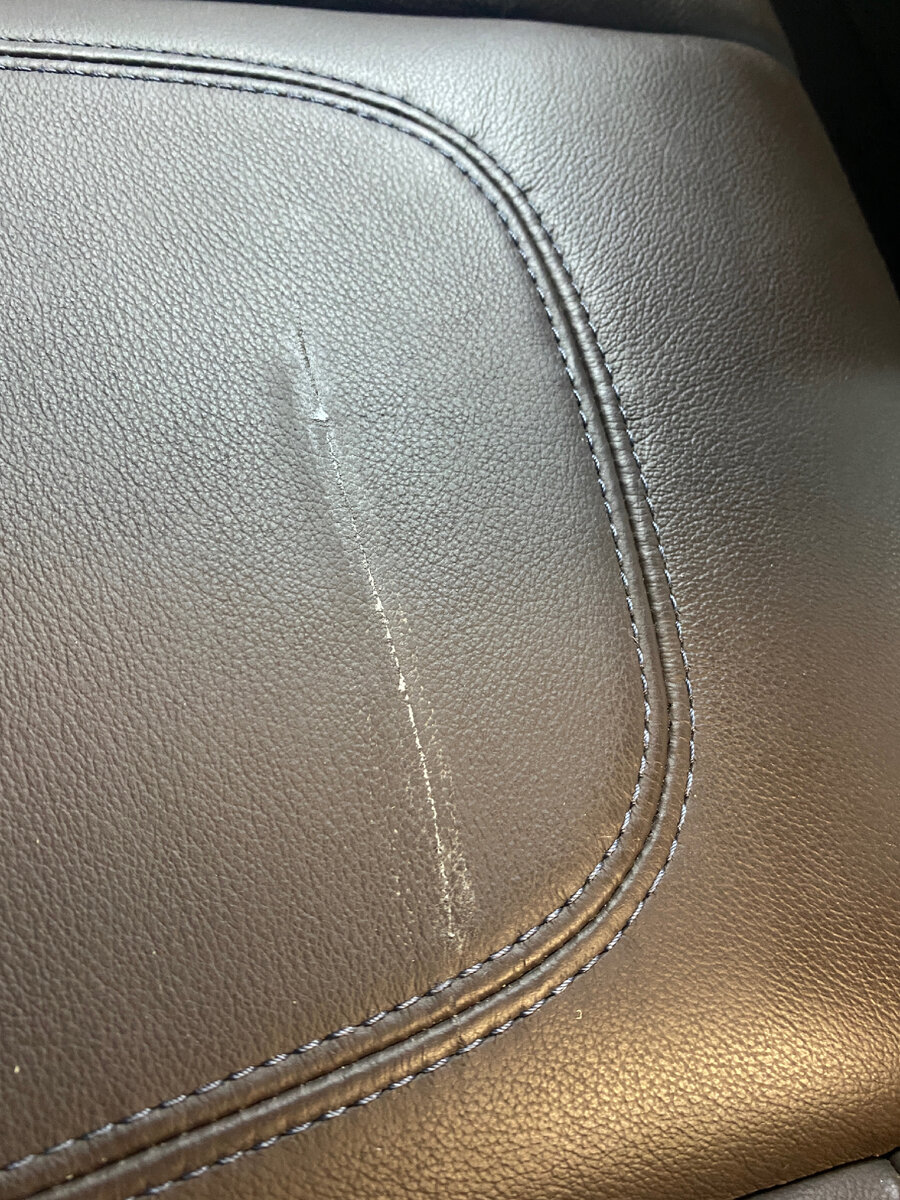 Бывает такое, что идеальные салоны авто портят вот такие царапины от сумок или перевозки животных) Такие повреждения тоже довольно частое явление. 1. Очищаем поверхность кожи очистителем. Наносим пену щеткой, убираем сухой салфеткой. 2. Далее протираем место покраски обезжиривателем. В данном случае красили кусок кожи от шва до шва, поэтому скотчем заклеиваем так же остальные части кожи, которые не собираемся окрашивать . 3. Зашкуриваем данный фрагмент кожи. Подшпаклевываем саму царапину. В данном случае место реставрации небольшое, отсутствие текстуры не будет так заметно. 4. Подбираем краску. 5. Наносим базу для покраски, добавляем в нее отвердитель, чтоб все лучше держалось. Наносим в два слоя. 6. Далее красим в два слоя. 7. Наносим два слоя матового лака с отвердителем, чтобы закрепить результат.