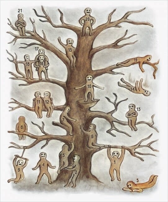 Перед вами рисунок дерева, на котором изображены человечки с разным настроением и находящиеся в разных местах.