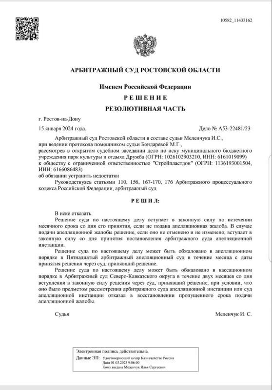 Арбитражный суд Ростовской области отказал в удовлетворении иска администрации парка «Дружба» к компании-проектировщику «Стройпластдон». Информация об этом есть в картотеке суда. Иск на компанию, которая занималась проектом благоустройства парка «Дружба», подали в октябре 2023 года.
