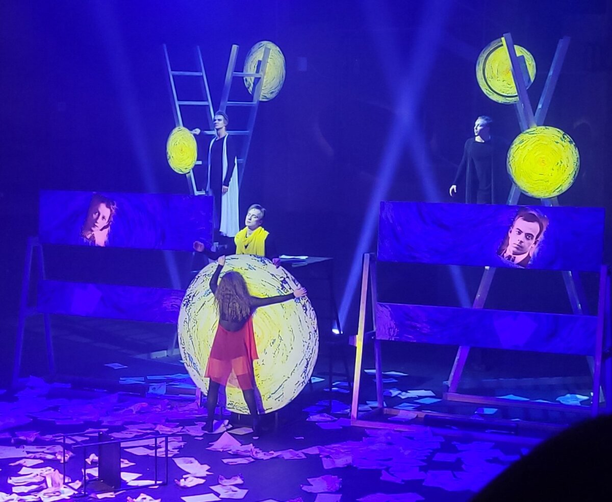 Интересное решение с декорациями — красиво обыграна картина Ван Гога «Звездная ночь», которая иногда по разному подсвечивалась. И самолёт оригинально придуман, и крылья, и пропеллер появляются в подходящие по ходу пьесы моменты как буд-то из ниоткуда.