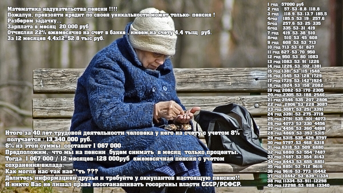 математика пенсии!! Проснитесь зомби!!! Математика надувательства пенсии Пожалуй, превзойти кредит по своей уникальности может только- пенсия ! Разберем задачку… Зарплата в месяц 20 000 руб Отчисляя 22% ежемесячно на счет в банке , имеем на счету 4,4 тыщ руб. За 12 месяцев 4,4х12=52,8 тыс руб. 1 год =57000 руб 2 год 57+53+8,8=118,8 3 год 118,9+53+13,7=185,5 4год 185,5+53+19= 257,6 5год 257,6+53+25=335 6год 335+53+31=419 7 год 419+53+38=510 8год 510+53+45=608 9 год 608+53+53=713 10 год 713+53+61=827 11 год 827+53+70=950 12 год 950+53+80=1083 13 год 1083+53+91=1226 14 год 1226+53+102=1381 15 год 1381+53+115=1548 16 год 1545+53+128=1729 17 год 1729+53+142=1924 18 год 1924+53+158=2082 19 год 2082+53+170=2305 20 год 2305+53+188=2546 21 год 2546+535+207=2806 22 год 2806+53+228=3087 23 год 3087+53+251=3391 24 год 3391+53+275=3719 25 год 3791+535+301=4073 26 год 4073+53+330=4456 27 год 4456+53+360=4869 28 год 4869+53+393=5315 29 год 5315+535+429=5797 30 год 5797+53+468=6318 31 год 631