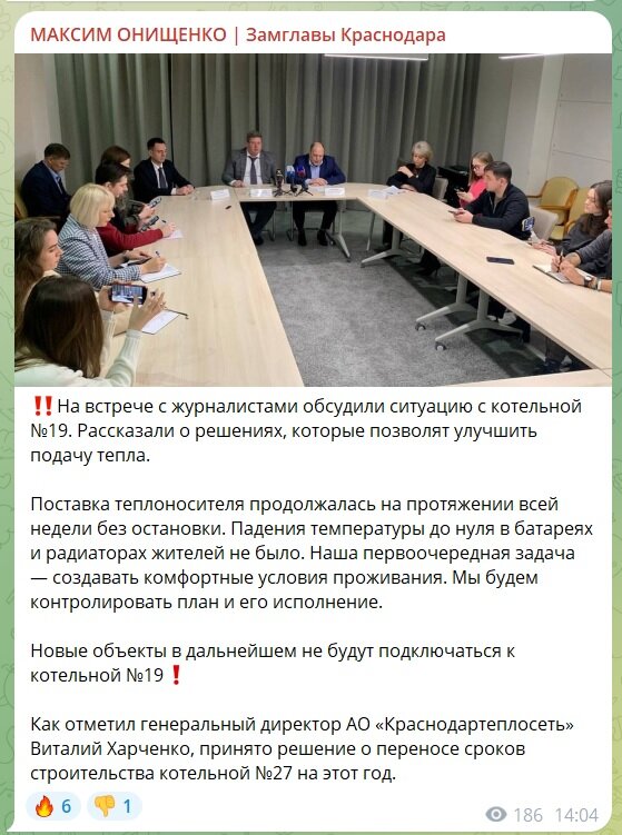 В Краснодаре 19 января вице-мэр Максим Онищенко и генеральный директор АО «Краснодартеплосеть» Виталий Харченко в ходе экстренного брифинга по проблемам с теплоснабжением пообещали замерзавшим жителям перерасчёт при оплате услуг, а также обвинили Подмосковье и Ярославскую область в возникших сложностях. Виновников в Краснодаре не нашлось. Накануне о необходимости ответить на все животрепещущие вопросы, связанные с рядом коммунальных аварий, приведших к перебоям с отоплением, заявил лично глава Краснодара Евгений Наумов. Брифинг для журналистов собрали в максимально короткие сроки. Объяснять, почему днями мёрзли жители Восточно-Кругляковского и других микрорайонов, а после ремонтных работ отопление вновь исчезало, направили ответственного заместителя мэра Максима Онищенко и гендиректора «Краснодартеплосетей». С очень серьёзным лицом Максим Онищенко отметил позитивную сторону истории с массовым замерзанием краснодарцев, которая должна греть им душу. - Поставка теплоносителя продолжалась