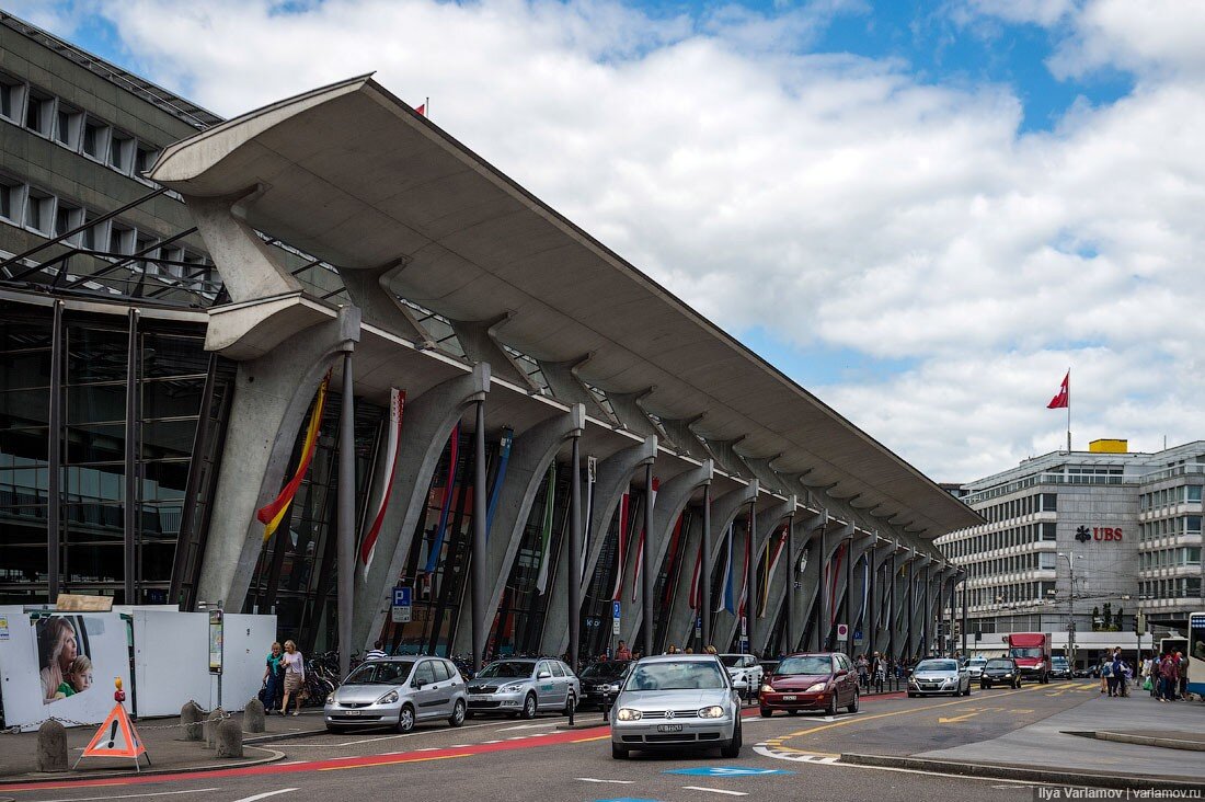 01. Прогулка по Люцерну начинается со здания железнодорожного вокзала. Оно было построено в 80-х годах архитектором Сантьяго Калатравой. Фасад выполнен из стекла, а кровлю поддерживают металлические опоры