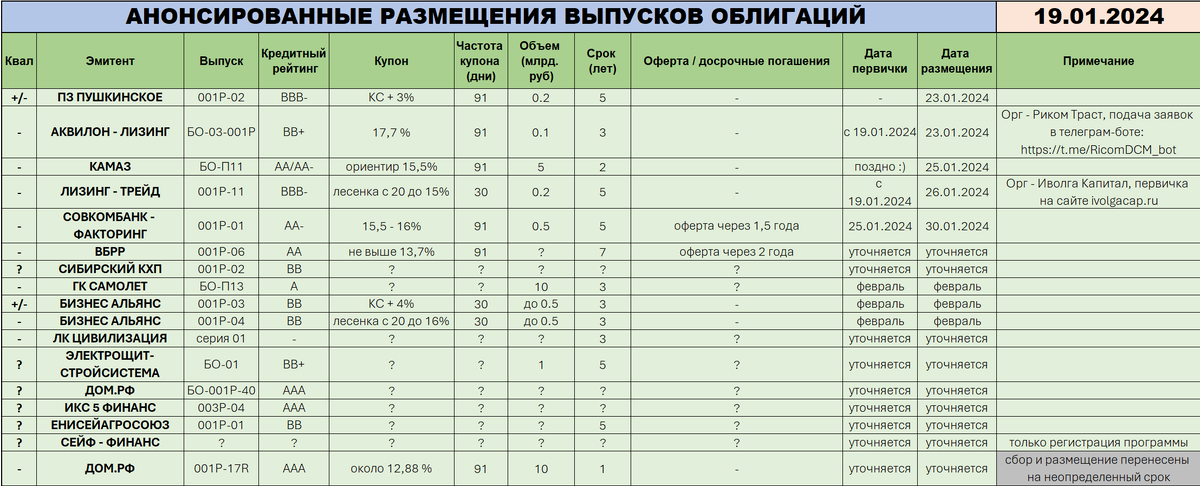 🍷 Пятничный вестник уже можно встречать с бокалом виноградного сока, друзья, привет! Конец недели даже интересных новостей принес, о которых я вам с радостью расскажу! К ним! ---------- 🆕 НОВЫЕ РАЗМЕЩЕНИЯ / АНОНСЫ: ❄️ АКВИЛОН - ЛИЗИНГ (🅱️🅱️➕) раскрывает полные параметры своего выпуска 03-001Р! Рынку предложены скромные 100 миллионов рублей на три года, зато без оферты. Из моментов, которые могут подойти не всем, лишь амортизация, которая по восемь процентов будет погашать стоимость бумаги, начиная с первой выплаты. Но взгляните как на плюс - если вдруг дефолт (тьфу-тьфу), то уже не всю сумму потеряете :) Купон квартальный, 17,7%, что чуть хуже последних рыночных предложений от коллег по цеху лизинга, но в целом на перспективу ничего себе. Организатор первички - Риком-Траст, заявки открылись сегодня, а вот размещение на бирже запланировано на 23 января. ❄️ ЛИЗИНГ - ТРЕЙД (🅱️🅱️🅱️➖) ворвался в раздел крайне неожиданно. Утренний анонс нового выпуска обрушил на пару процентов коти