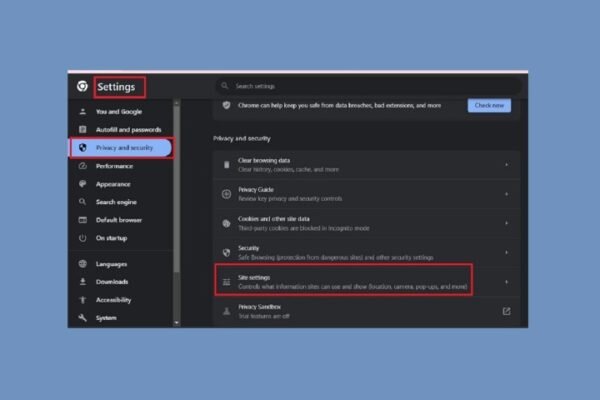 Шаг 2: Перейдите в раздел Настройки → Конфиденциальность и безопасность → Настройки сайта, затем перейдите вниз и выберите пункт Уведомления.