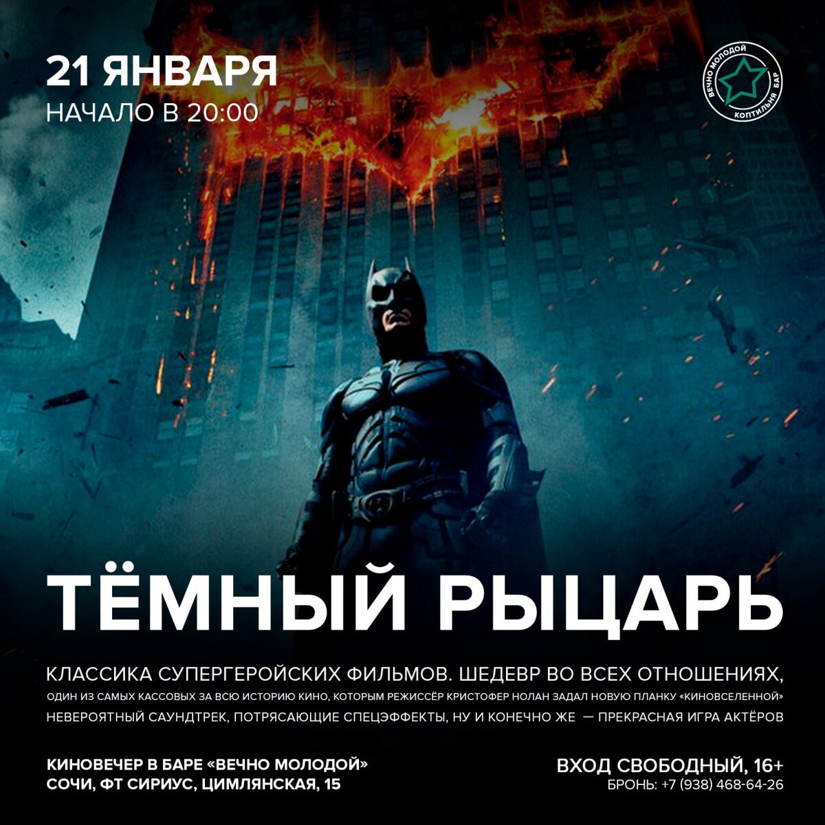 Классика супергеройских фильмов. Шедевр во всех отношениях, один из самых кассовых за всю историю кино, которым режиссёр Кристофер Нолан задал новую планку «киновселенной». Невероятный саундтрек, потрясающие спецэффекты, ну и конечно же прекрасная игра актёров. Начало в 20:00, вход свободный