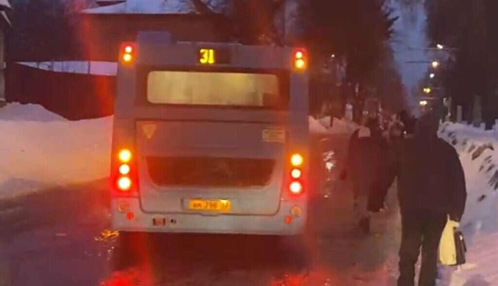 Как чистят дороги в Брянске: автобус №31 раскорячился в гололед на Урицкого