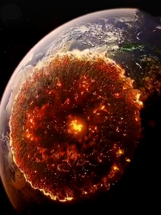 Полыхающий астероид врезался в планету на северо-западе, при этом сместив ось Земли и привел все в беспорядочное движение, создав хаос. Густые клубы дыма заслонили Солнце, а ядовитые газы отравили атмосферу. Оставшиеся в живых существа погибли в страшных мучениях.