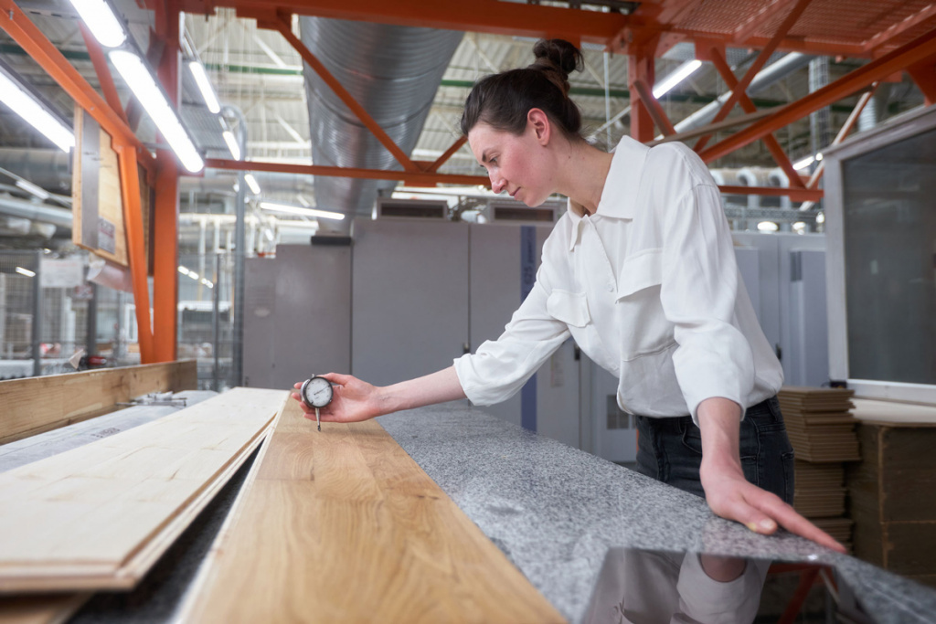 Актуальнее всего этот этап для производства трехслойного паркета, поскольку именно здесь разрозненные и разноформатные заготовки превращаются в практически готовую паркетную доску. Причем при производстве 2-3 полосного паркета сначала на автоматизированной линии склеиваются торцами верхние ламели (при изготовлении однополосной доски этот этап, по понятным причинам, пропускается), а затем отправляются на склейку слоев. С конвейера склейки доски попадают в пресс, где для большей прочности тщательно спрессовываются и прогреваются. После склейки заготовки обравниваются в размер для получения правильной геометрии.