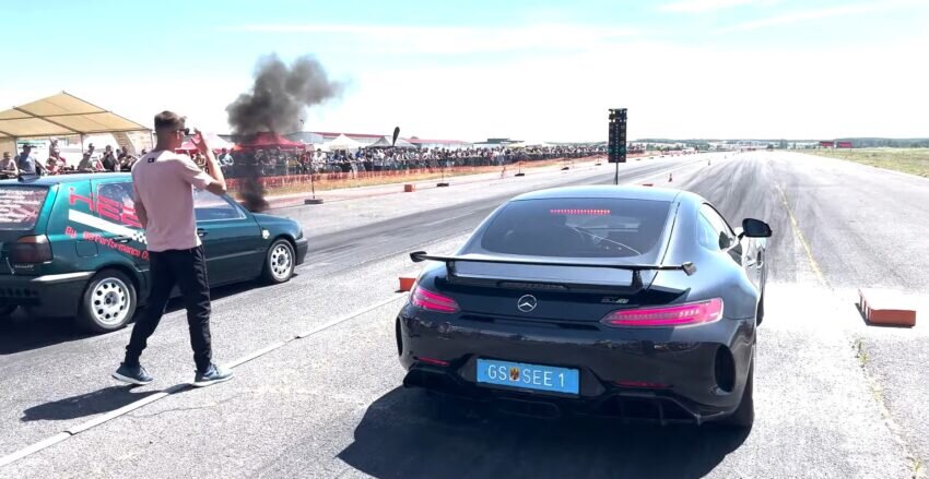 Volkswagen Golf 1.9 TDI Mk3 тащит Mercedes-AMG GT R, кто-то курит в сторонке