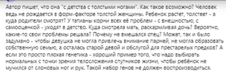 Для тех, кто не очено со зрением, процитирую в тексте: "Автор пишет, что она "с детства с толстыми ногами". Как такое возможно? Человек ведь не рождается в форм-факторе толстой женщины. Ребенок растет, толстеет - а куда родители смотрят? У татианы корни всех её проблем - с внешностью, с самооценкой - уходят в детство. Куда смотрела мать, раскармливая дочь? Вероятно, какие-то свои проблемы решала? Почему не вмешался отец? Может, так и было задумано - чтобы девушка не могла привлечь внимание парней, не могла образовать собственную семью, а осталась старой девой и обслугой для престарелых предков? А если это просто плохая генетика - хороший пример того, что надо выбирать нормальных с точки зрения телосложения спутников жизни, чтобы ребёнок не мучился от слоновых ног и рук. Такой набор генов не должен воспроизводиться". Просто ответьте мне - это тоже милая, допустимая шутка? Просто очень остроумно, признак высокого интеллекта и хорошего расположения ко мне? В чем тут юмор? Общаются ли так