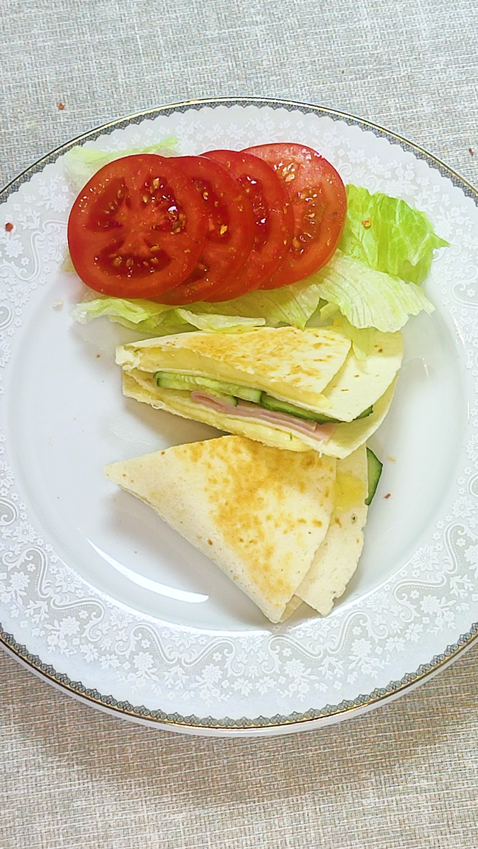 Разрезать лаваш как показано на видео. Начинка огурец, ветчина и сыр. Поджарить на сухой сковороде.