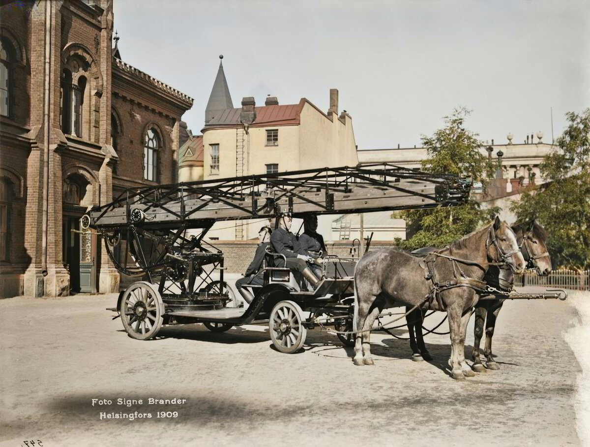 Сегодня мы совершаем экскурсию в отдаленную во времени Финляндию начала ХХ-го века. На кадрах представлены Хельсинки в объективе Сигне Брандер, тогда город назывался Гельсингфорс. Все фотографии прошли через колоризацию. Механическая пожарная лестница Силтавуоренранты 1909 год. Более ста лет назад Сигне Брандер была первой женщиной-фотографом, сделавшей снимки городского пейзажа и жителей Хельсинки. Шведоязычная начальная школа. Она родилась в 1869 году в Паркано на юго-западе Финляндии. Ее отец Эрнст Брандер владел там большой фермой, а ее мать Дженни Брандер была уроженкой Швеции. У Сигне Брандер было еще шесть братьев и сестер. Семья переехала в прибрежный город Коккола, расположенный дальше на север, когда отец устроился там таможенником в 1873 году. Ребята во дворе, 1911 год. После смерти отца в 1891 году мать с дочками переехала в Хельсинки. Там Сигне Брандер сначала получила степень, по которой она стала учителем рисования, но никогда не работала учителем. Вместо этого она обра