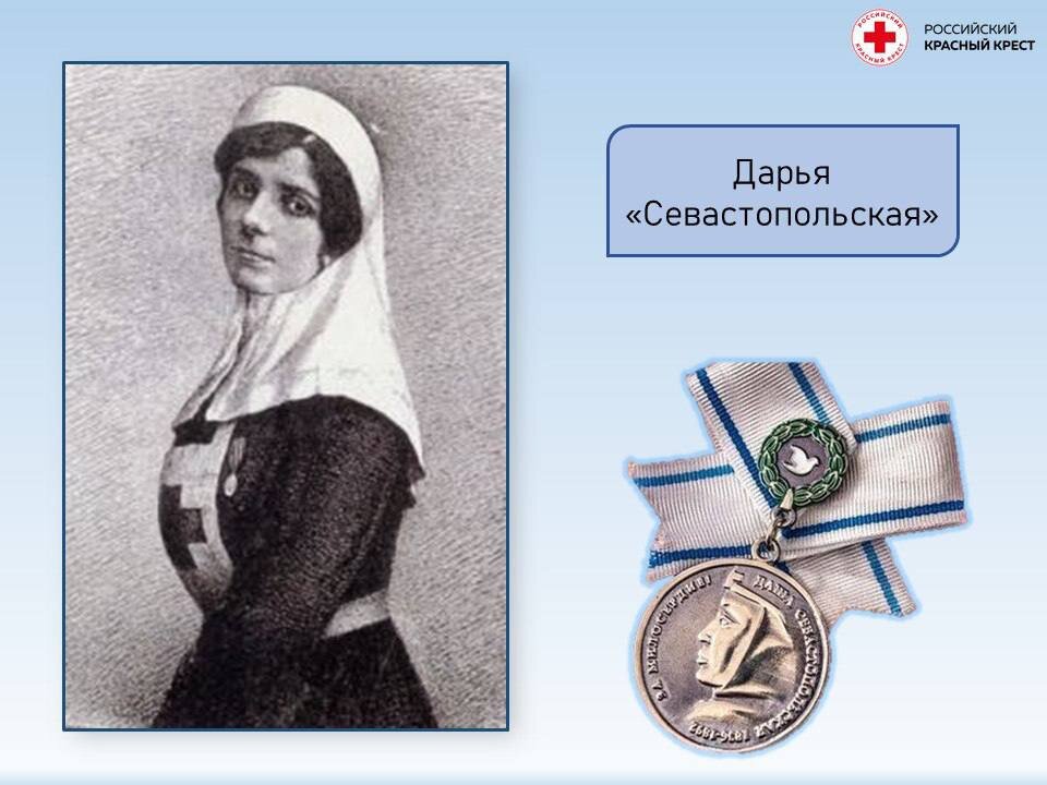 «Даша Севастопольская», считается первым признанным примером подобного рода женской помощи раненым на поле боя. Она удостоилась быть первой женщиной из народа, награжденной золотой медалью «За усердие».