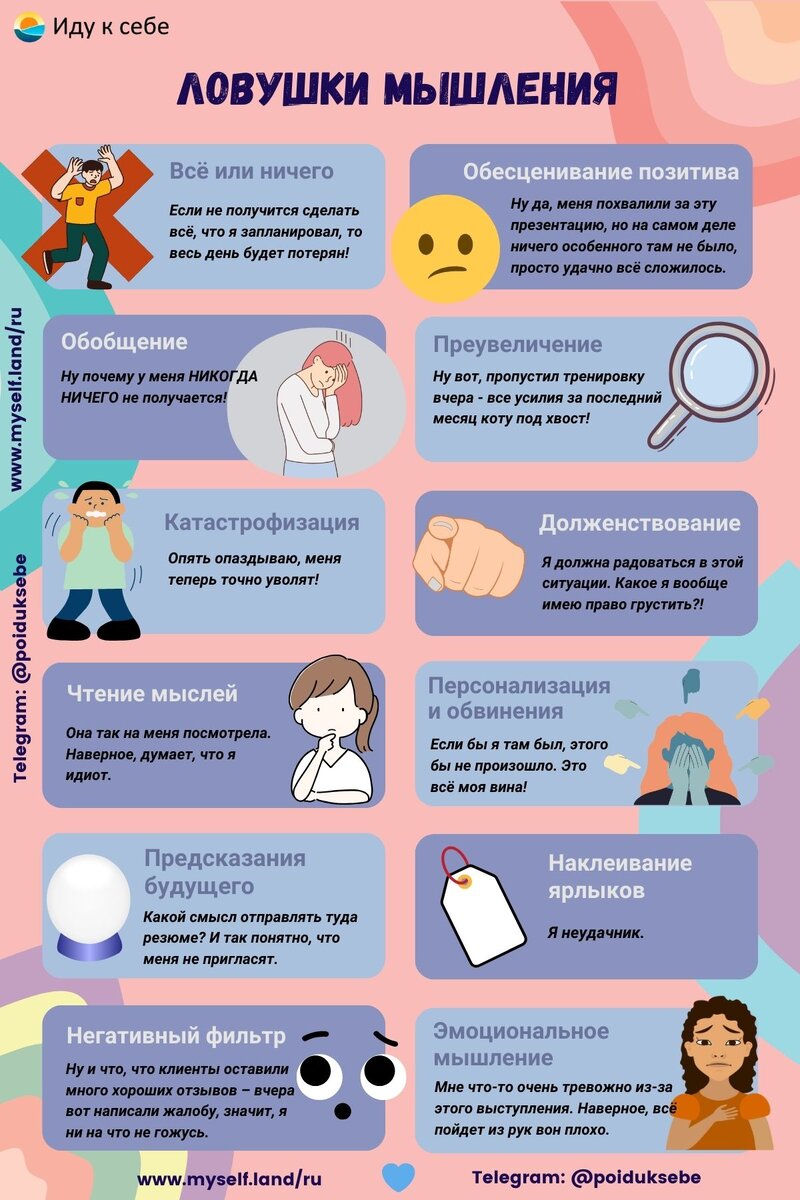 В этой статье мы говорили о том, как часто верим мыслям, которые не отражают реальность, а обманывают нас. Такие ловушки мышления психологи называют когнитивными искажениями. Рассмотрим самые распространенные из них, с которыми имеют дело многие из нас. А в конце статьи - наглядная шпаргалка для определения когнитивных "ловушек".