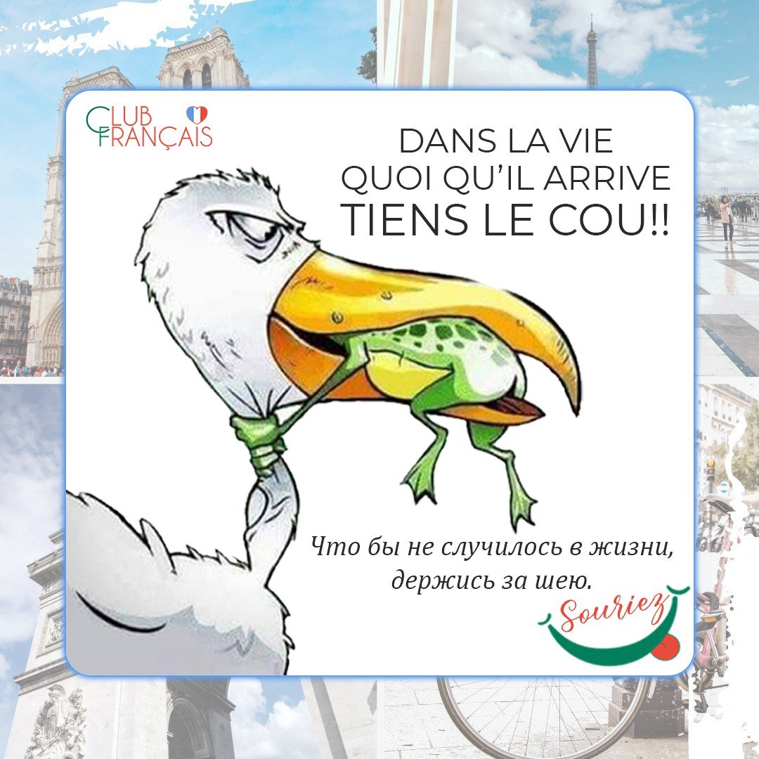 Фраза на картинке содержит сразу два интересных элемента, запоминайте: ▫️quoi qu'il arrive... — что бы ни случилось... ▫️Tiens le coup ! — Держись! (tenir - держать, tenir le coup - выдержать удар, продержаться + в схожем значении выражения tenir bon - держаться молодцом и tenir ferme - стоять на своем) Allez, tenez le coup ! C'est samedi ! 🇫🇷 Сайт онлайн-школы Club Français