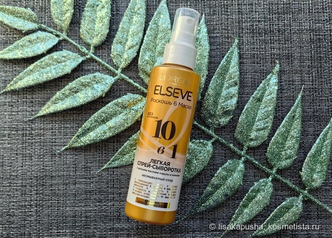 У меня длинные сухие волосы, которые очень тяжело расчёсывать из-за сильного и постоянного спутывания. Поэтому каждый раз мне приходится наносить какое-нибудь средство, чтобы хоть как-нибудь облегчить себе задачу. Не так давно я наткнулась на спрей от Эльсев. О марке я хорошего мнения, поэтому решила попробовать. Первое, что бросилось в глаза — интересное оформление. Хоть флакончик и выполнен из пластика, но производитель сделал всё, чтобы он выглядел интересно. Отмечу, что дозатор у сыворотки качественный, на нем даже есть выемка под подушечку пальца. Детали все не хлипкие, видно, что производитель вложился как в идею, так и в производство. Средства 10 в 1 — это не пустые обещания, а, действительно, рабочие лошадки. Производитель обещает эффекты для волос, которые можно проверить. Использую один раз в день при расчёсывании. Почему один? В составе большое количество масел, которые, к сожалению, утяжеляют волосы. Два раза в день позволить себе такое удовольствие, к сожалению, не могу. Т